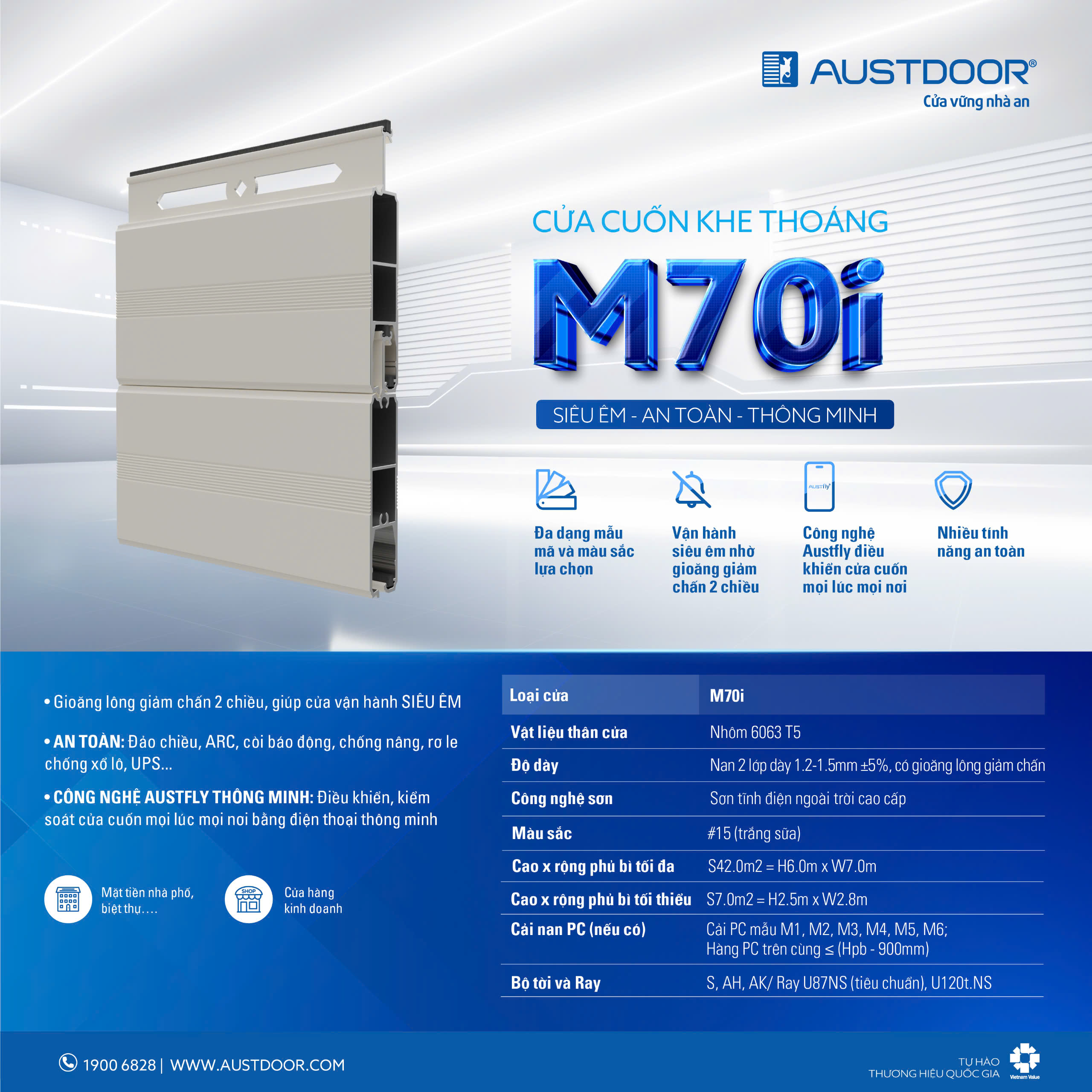 Cửa cuốn Austdoor M70i là giải pháp hoàn hảo cho những ai đang tìm kiếm sự an toàn, tiện nghi và thẩm mỹ. Với các tính năng hiện đại như gioăng lông giảm chấn siêu êm, công nghệ điều khiển Austfly thông minh và màu sắc tinh tế, sản phẩm này chắc chắn sẽ nâng tầm giá trị cho ngôi nhà bạn.